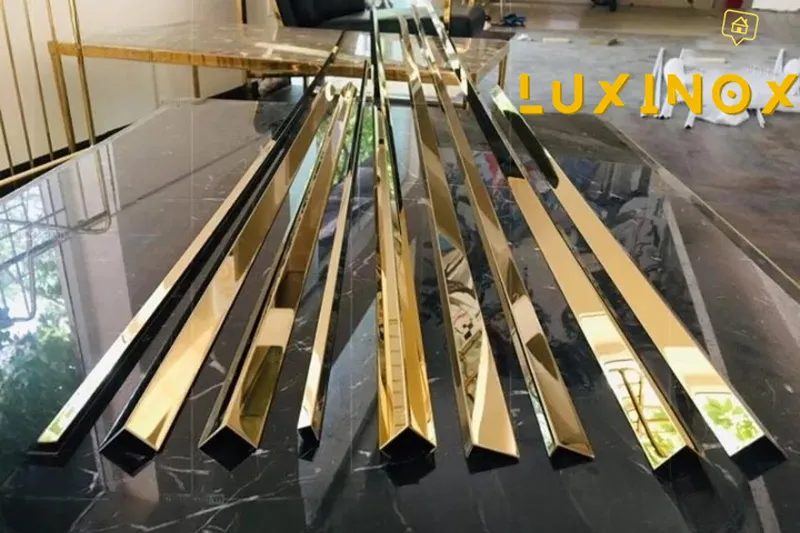 Nẹp inox chữ T Đà Nẵng: Được sản xuất từ inox 304 hoặc inox 201, bề mặt mạ PVD nhiều màu sắc sang trọng như vàng gương, đen titan, hồng gương, đồng xước. Chịu lực tốt, không gỉ sét, độ bền vượt trội, đặc biệt phù hợp với công trình cao cấp như khách sạn, nhà hàng, showroom.