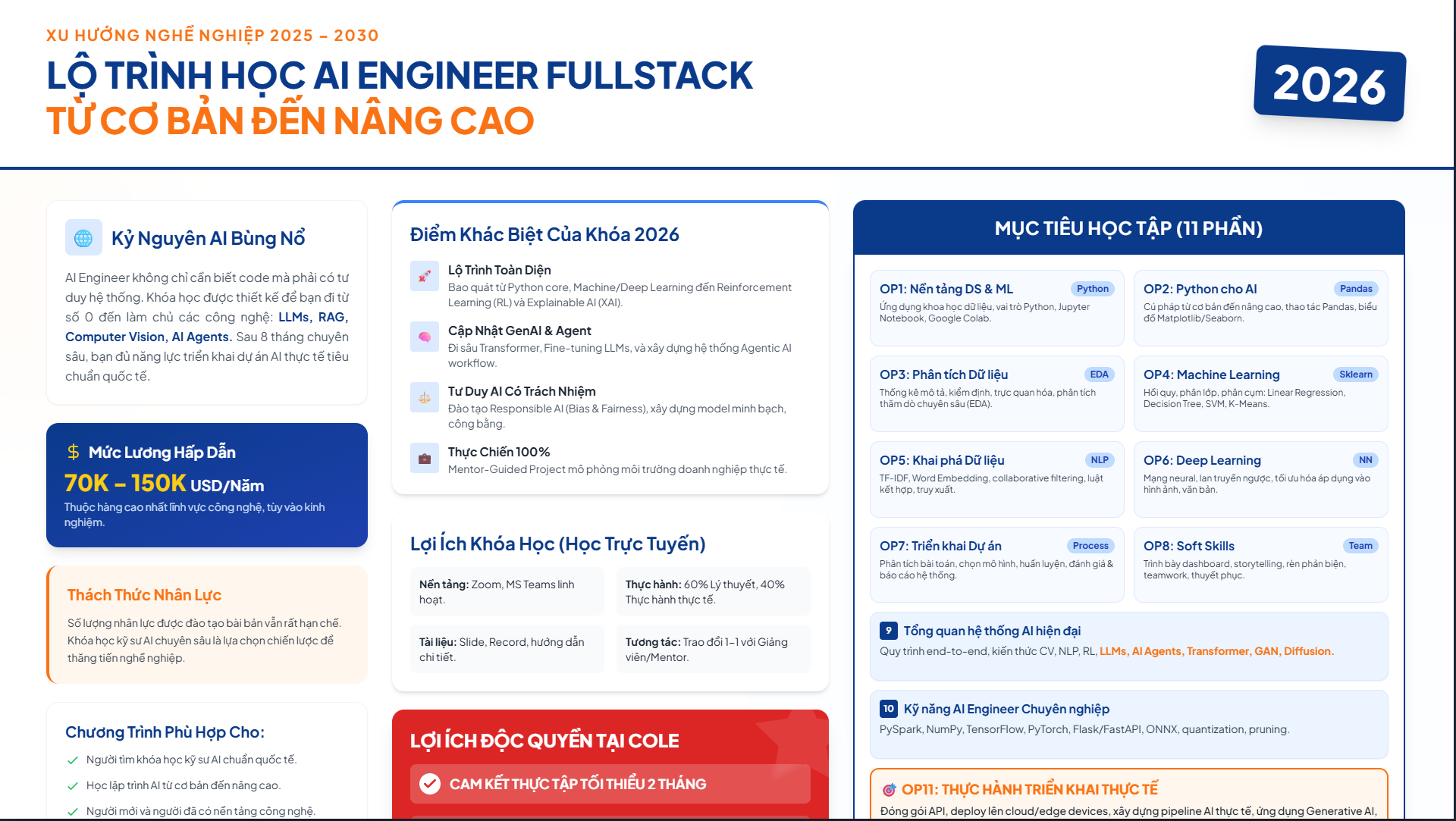 Chương trình AI Engineer Fullstack 2026 tại cole.vn hiện đang mở đăng ký với 62 buổi học online có video record, giảng viên là tiến sĩ và chuyên gia AI đang hoạt động thực tế tại các công ty công nghệ lớn.
